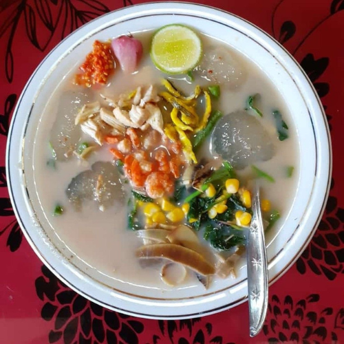 Hidangan berkuah bening yang segar dengan isian potongan ubi, daging, mie, dan tauge, cocok dinikmati dengan perasan jeruk nipis.