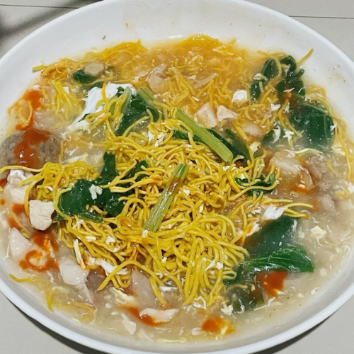 Mi kering yang digoreng hingga renyah, disajikan dengan kuah kental berbahan dasar tepung maizena dan telur, serta toping aneka sayuran dan seafood.