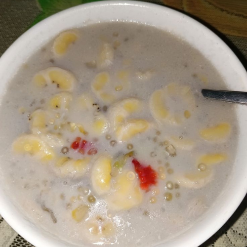 Makanan berbahan dasar sagu yang dibentuk bulatan kecil, disajikan dalam kuah berbumbu dengan aneka sayuran dan ikan.