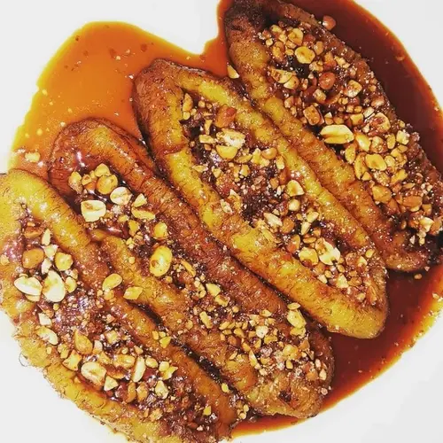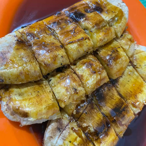 Pisang setengah matang yang dipipihkan, dibakar, kemudian disiram dengan saus gula merah yang kental dan manis.