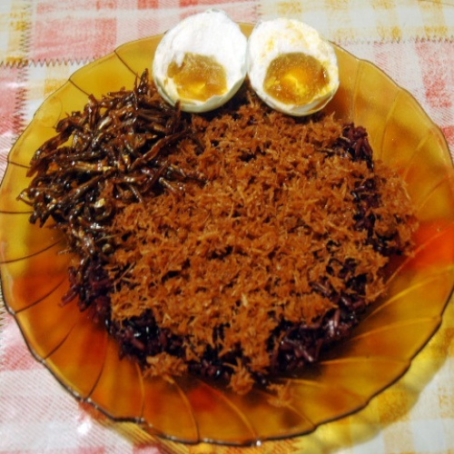 Hidangan ketan hitam kukus yang disajikan bersama serundeng kelapa, lauk pauk, dan sambal, sering dijual oleh penjual keliling pada malam hari.