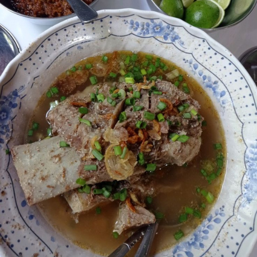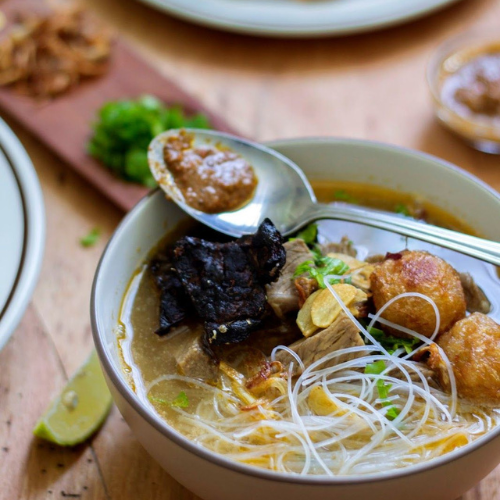 Sup daging sapi berkuah kental yang kaya rempah, disajikan hangat dengan taburan bawang goreng dan sambal tauco.